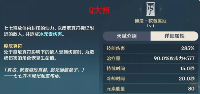 1.大招的治疗量基于七七的攻击力,奶量很大,但E技能不产元素颗粒,因此只能当随缘技能。
