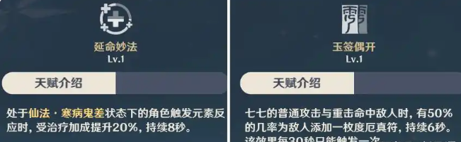 一命,E技能寒病鬼差持续伤害,命中大招的度厄真符标记的敌人时,七七恢复2点元素能量,虽然提升元素能量恢复,但有点鸡肋,要求过高,操作麻烦,而且才2点元素能量,对于大招80元素能量来说,简直是九牛一毛。