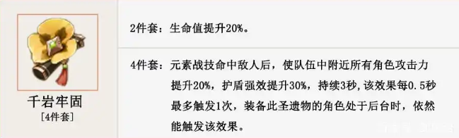 千岩牢固4件套:虽然提升20%生命值,对七七没什么用,但七七E技能可以脱手挂后台持续输出,则可以触发队伍提升20%攻击力,如果队伍有护盾角色套盾,还可以提升30%护盾强效,辅助的七七佩戴极佳的。