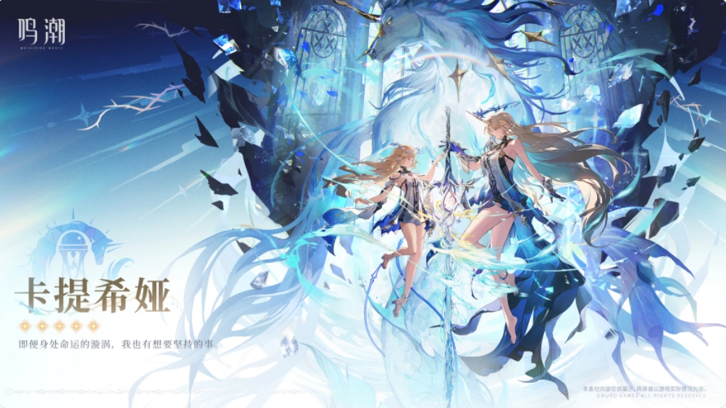 作为首位常态与觉醒双形态角色,卡提希娅可切换迅刀与巨剑形态,技能包含气刃回旋、风轨突袭及引发真实伤害的终结技“苍穹崩裂”。
