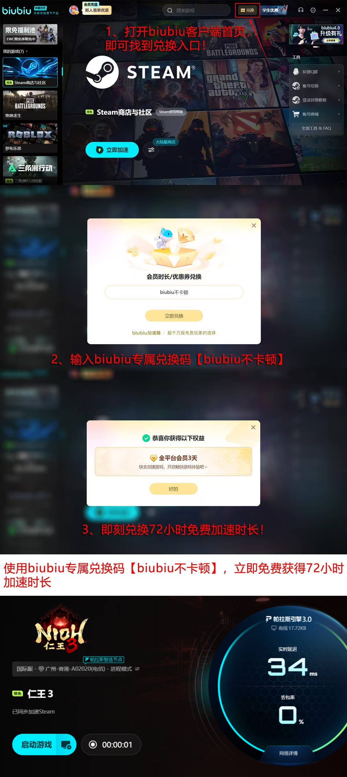 新注册用户首次启动biubiu加速I器时,系统自动发放24小时全功能免费试用权限。若需延长体验周期,可在设置页面输入兑换码【biubiu不卡顿】,即可额外激活3天连续加速服务,无需绑定支付方式。