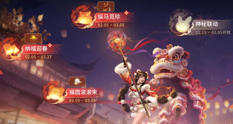 第二项活动“纳福迎春”为周期性登录激励:自2月5日起,连续签到可分阶段解锁奖励——首日领取新英雄方诺;累计7日获得动作“狮来运转”;满14日可获取珍稀背景“喜迎春”。第三项“福运滚滚来”支持PC与移动端数据互通,玩家通过完成指定任务积攒福运值,达标后可兑换神佑宝灯、舞狮枪、软萌元宵、瑞玉宝箱(任选)、福圆宝箱(任选)等高价值道具,整体奖励梯度清晰、实用性较强。