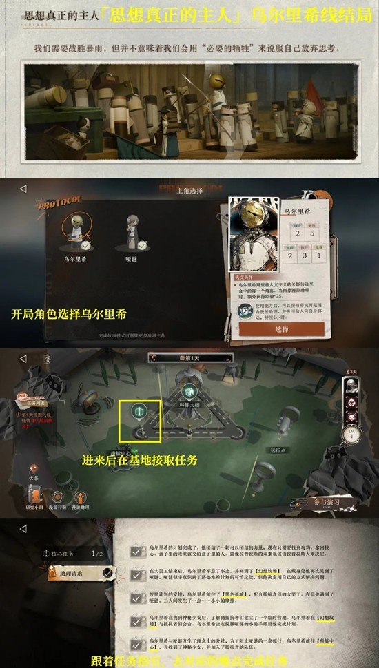 思想真正的主人——开局角色选择「乌尔里希」,在基地接取任务,按照任务指引去对应地点完成任务,再打完最终boss