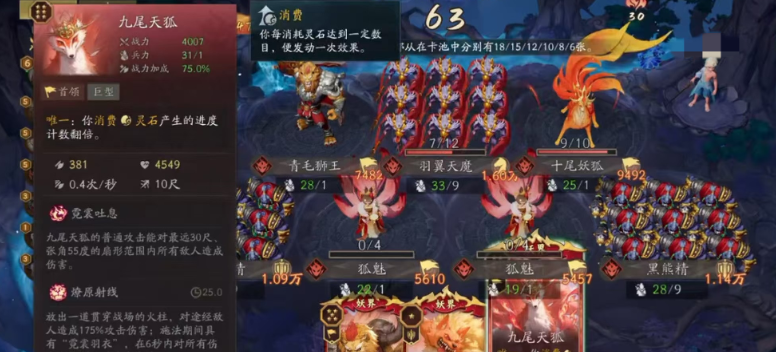 妖阵营的运转中枢是“妖气”资源系统——所有关键效果均与妖气数值强绑定。当前版本中,已形成两种高度成熟的构筑路径:消费流与战吼流。前者节奏紧凑、容错率高,适合入门阶段建立认知;后者依赖技能协同与单位联动,上限显著,对运营时机与技能释放节奏要求更高。无论选择哪条路线,十尾均为妖系核心幻神首选——其登场条件为妖气≥10点,且神通效果直接强化妖气收益循环,可有效放大整套阵容的资源转化效率与持续作战能力。