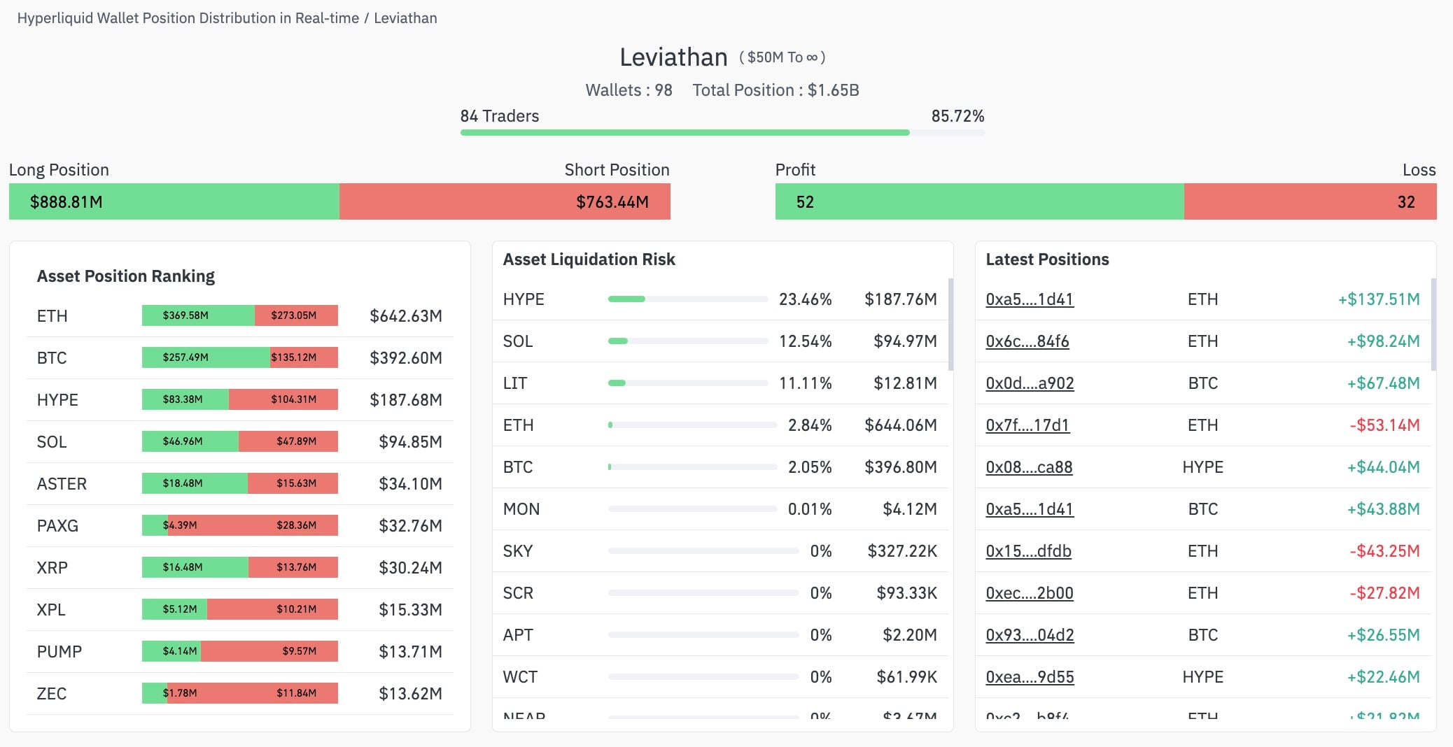 值得玩味的是,根据盈亏指标可被视为Hyperliquid"印钞机"的群体——即累计盈亏超100万美元的钱包——对比特币持看空态度。590个此类钱包的比特币空头头寸规模达4.168亿美元,而多头头寸仅为2.073亿美元。