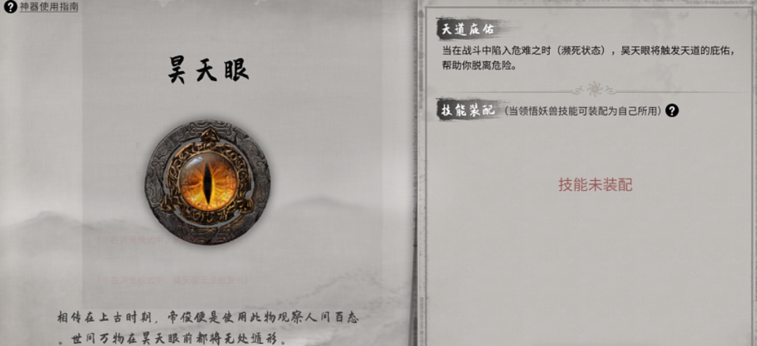 昊天眼是一件侧重于信息洞察与技能学习的神器,适合那些希望玩法更多样、愿意深入探索游戏机制的玩家。它的主要能力在于观察,可以让你查看其他角色的属性、生平乃至背包中的物品,实现知己知彼。在战斗层面,昊天眼能够识破妖兽的弱点,并有概率让你在与妖兽战斗后领悟并学会该妖兽的一个技能,这为你构建自己的技能体系提供了极大的自由度和可能性,有些强大的妖兽技能足以改变战局。它也提供了一种保命手段:当玩家陷入濒死危难状态时,昊天眼会触发天道庇护,扭曲空间将你传送至安全地点脱战。但使用这个保命能力需要付出代价,你会失去本场战斗中获得的所有道具,并且昊天眼会出现瑕疵,必须消耗2000灵石进行修复,在更高的洪荒难度下修复可能更为困难。
