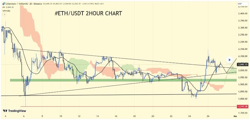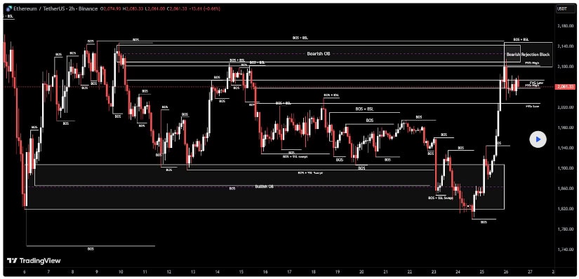 2小时图表显示ETH从1,800美元飙升至2,148美元后回撤至低位公允价值缺口,现交投于2,070美元附近,根据缺口反应可能测试2,025-2,115美元区间。来源:TradingView用户AmirAliTrading