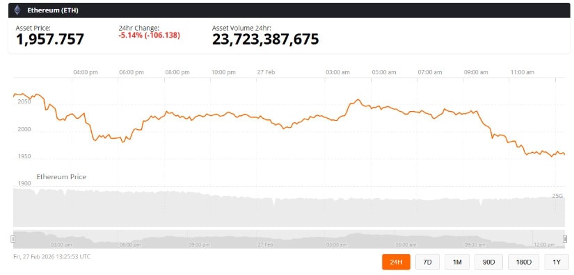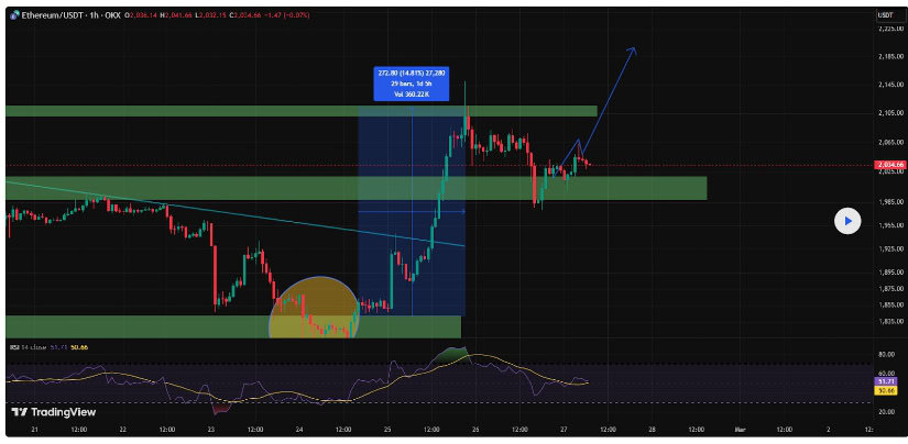 在本周早些时候守住1,920-1,950美元需求区间后,以太坊企稳并重新站上2,000美元心理关口。截至UTC时间2026年2月27日14:00,以太坊价格在主要现货交易所围绕2,000-2,050美元波动,此前一波剧烈拉升触及2,100美元后引发大量空头爆仓,随后部分回落。
