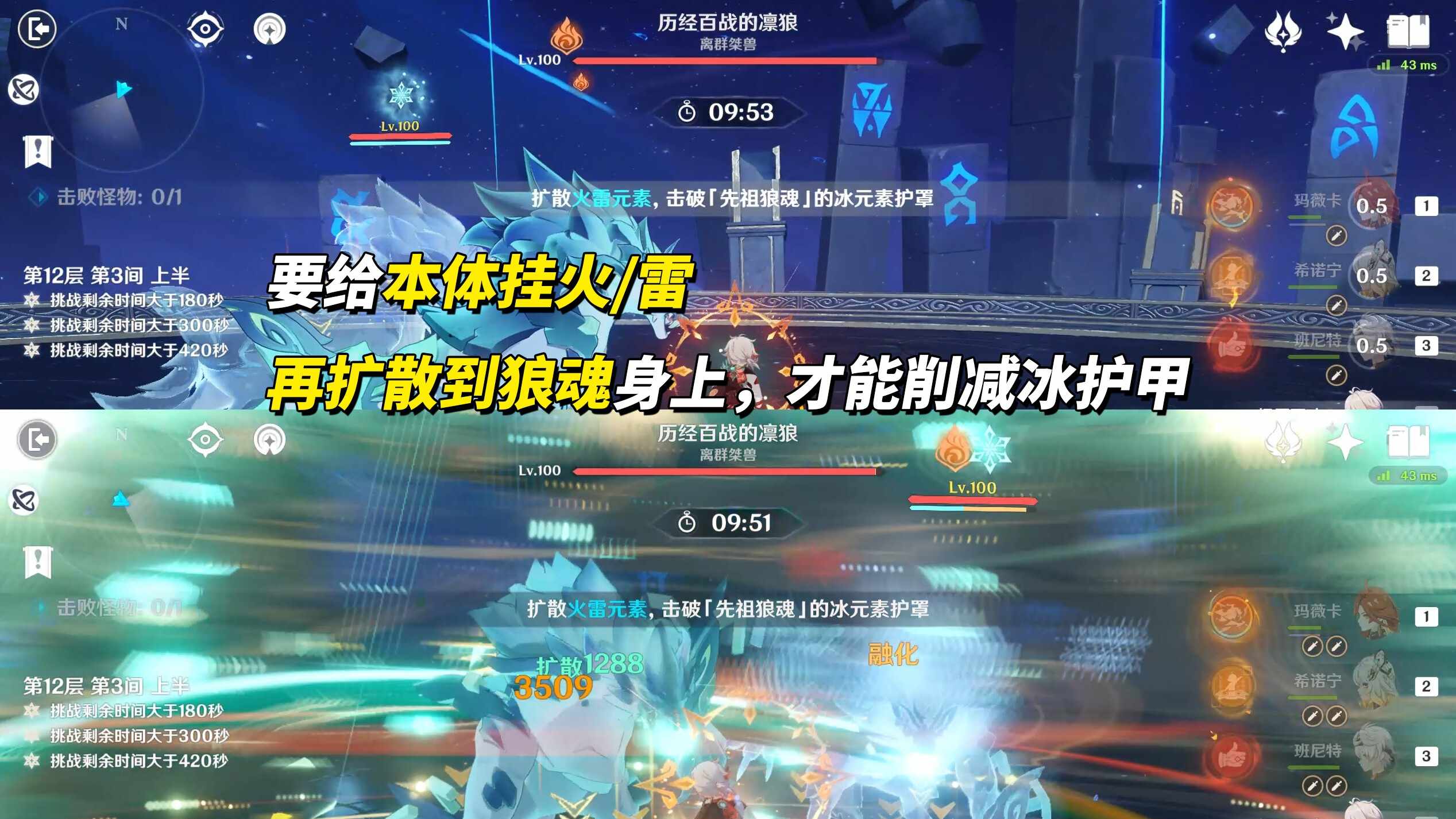 历经百战的蕴光凛狼,开局5秒后召唤拥有冰护罩的「先祖狼魂」,提升100%全抗,只能通过给本体挂雷/火并造成扩散反应才能破除。成功破除则BOSS瘫痪13秒,全抗降低70%。