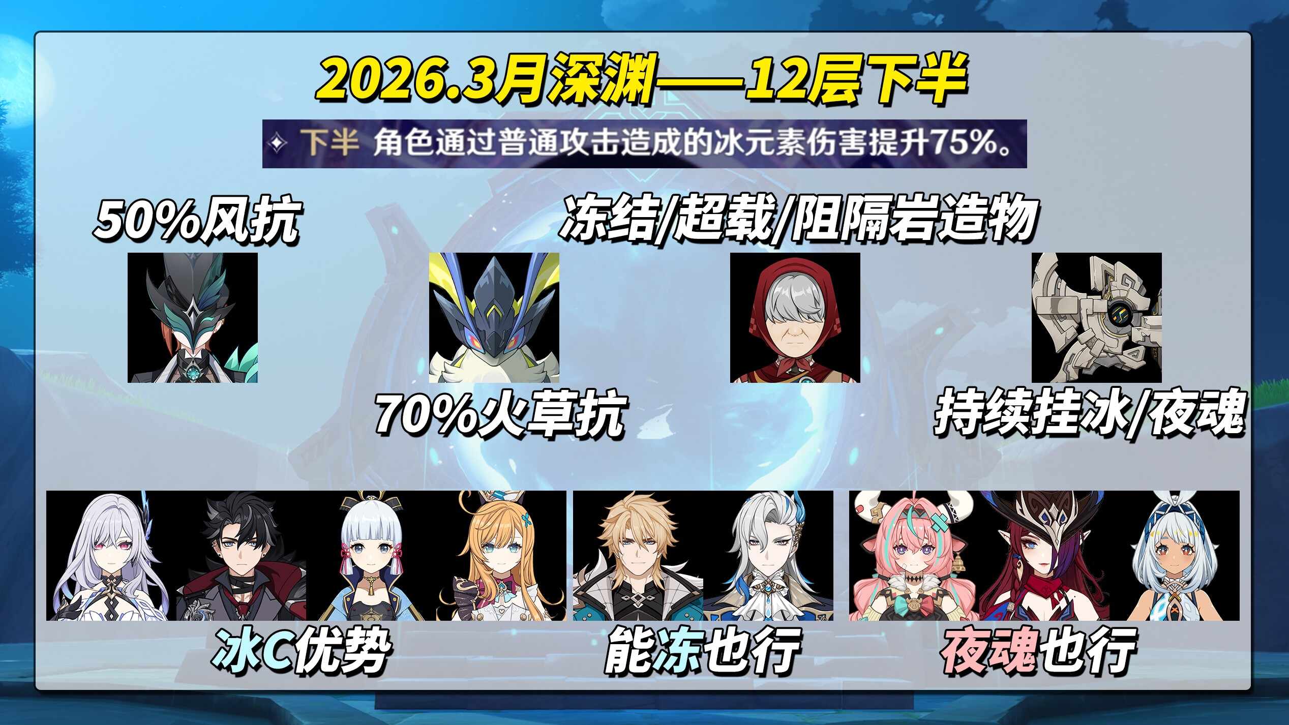 环境增益“角色通过普通攻击造成的冰元素伤害提升75%”,利好普攻冰伤C占比高的角色,如丝柯克、莱欧斯利、双冰法尔伽等等。下半原魔机制比较丰富,第1间需治疗、第2间需冻结/超载/阻挡型岩造物、第3间需持续挂冰/夜魂,