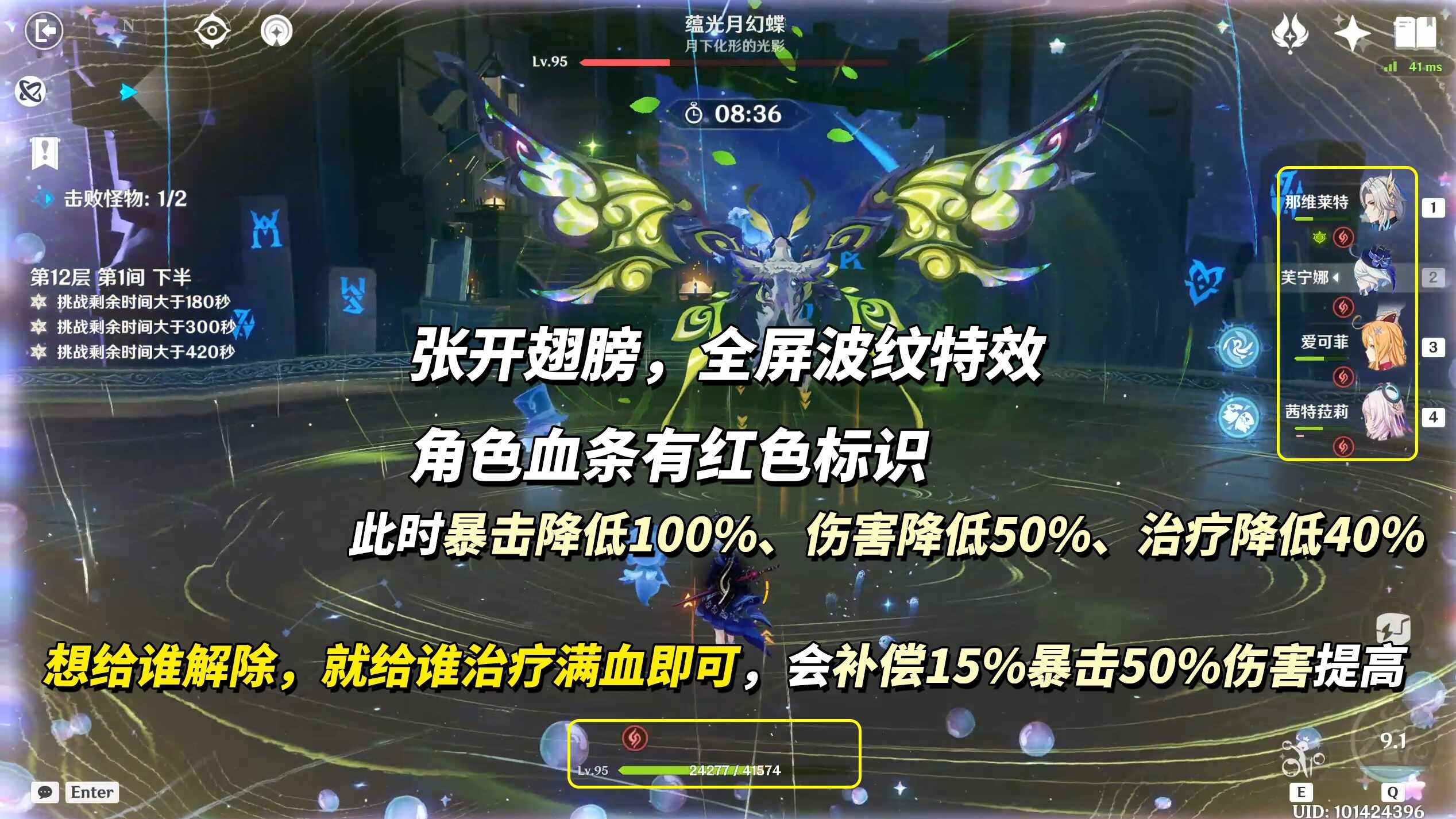 第1波的风役人(50%风抗),当自身被挂上生命之契,可用治疗解除,避免增幅对方技能造成的伤害。第2波蕴光月幻蝶(70%火草抗性),对局中会给全队挂“蕴光之茧”负面,降低100%暴击、50%伤害、40%治疗。