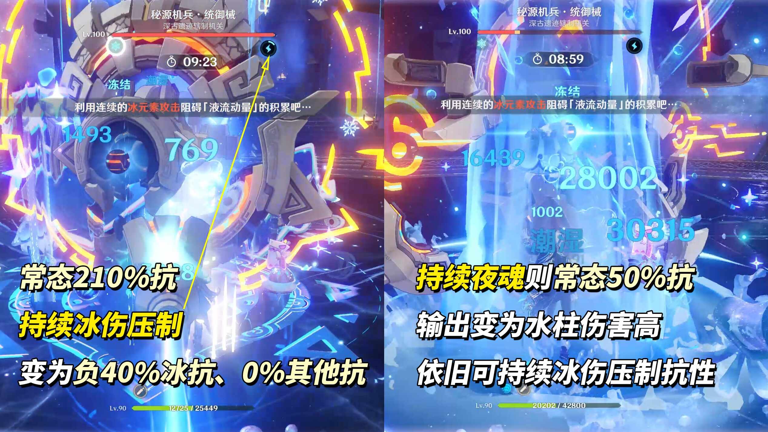 秘源机兵·统御械,常态210%全抗。当你通过高频冰伤压制它血量下方的能量条,使其临近清空,则会变为负40%冰抗、其余0%抗。夜魂角色维持夜魂加成状态,则会让他常态抗性变为50%,此时伤害大幅提高,仍可通过挂冰继续压制抗性。