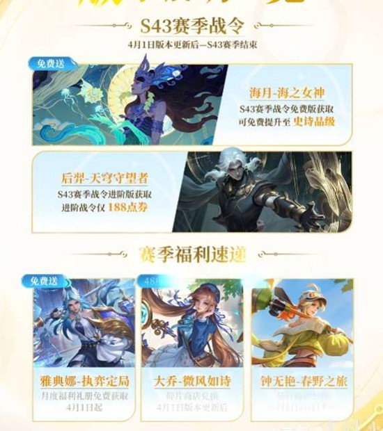 S43赛季战令作为新赛季的核心内容之一,将于4月1日与赛季同步开启。进阶版战令定价388点券使用优惠券可降至188点券,免费版战令无需付费即可参与。后羿史诗皮肤需进阶版30级获取,海月皮肤则可在免费版5级领取勇者形态后于40级升级为史诗品质。