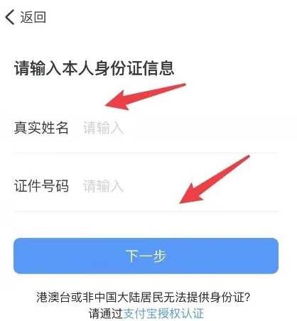 然后,输入认证的真实姓名、证件号码,进入下一步进行认证即可