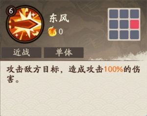 普攻—东风:攻击敌方目标,对敌方单体造成攻击100%的伤害。