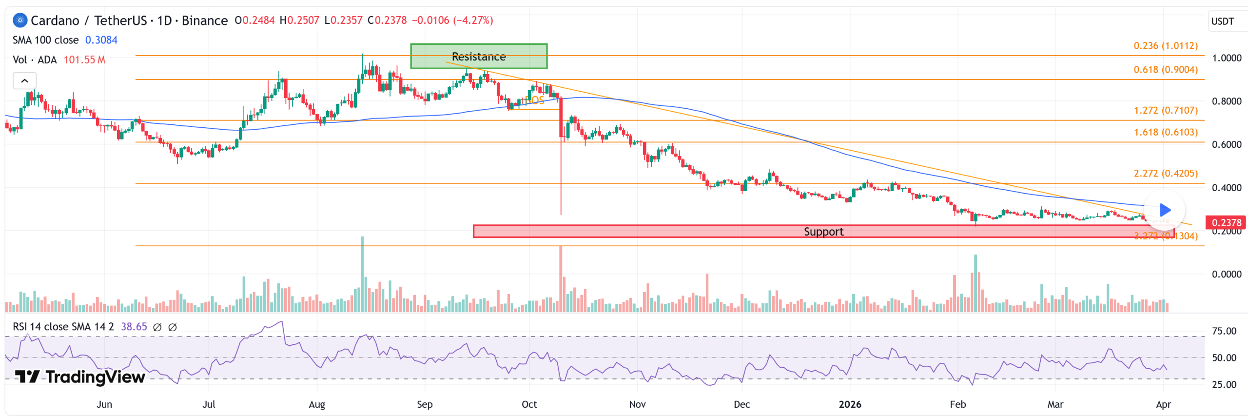 2025年8月曾短暂反弹至1.019美元,为部分投资者带来希望,但乐观情绪转瞬即逝。此后ADA每月持续下跌,从该高点累计回落75%。