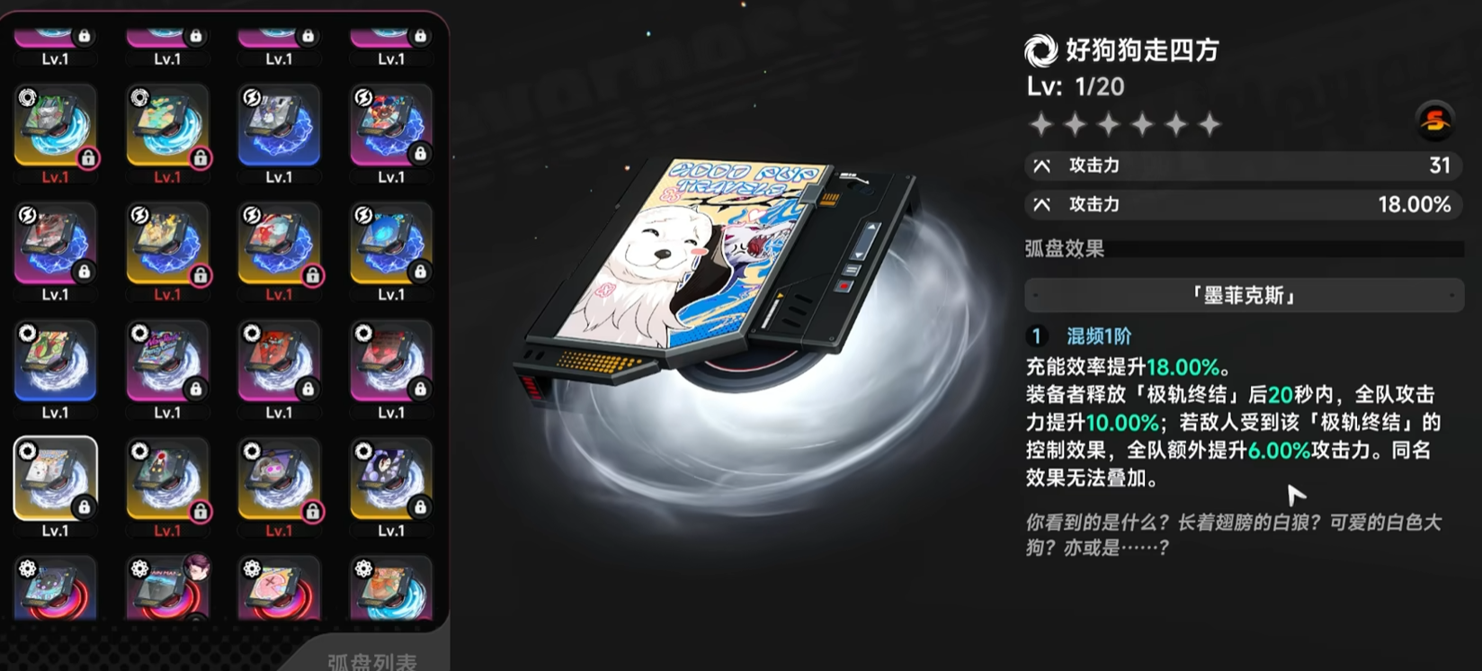《异环》作为一款融合都市幻想世界观与高强度动作机制的RPG作品,其深度装备体系直接决定了玩家在海特洛市探索与战斗的上限。其中,“好狗狗走四方”作为限定适配者专属S级弧盘,核心定位在于强化团队协同作战效能。该弧盘可显著加快蓄质速度,缩短关键技能冷却节奏;当角色释放极轨终结时,全队攻击力提升10%;若终结技附带控制效果,则额外触发全队5%攻击力加成。这一双重增益机制,使其成为高难度团队副本与BOSS攻坚阶段的首选配置,尤其适配具备稳定控制链与高频终结技使用习惯的角色。