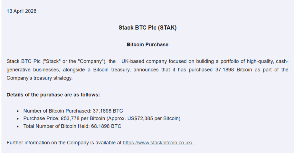 在Aquis交易所上市的Stack BTC本周一以约270万美元(折合200万英镑)购入37枚比特币,该公司由英国前财政大臣夸西·克沃滕担任主席。单枚比特币购入价约72,385美元。该公司目前共持有68.19枚比特币。