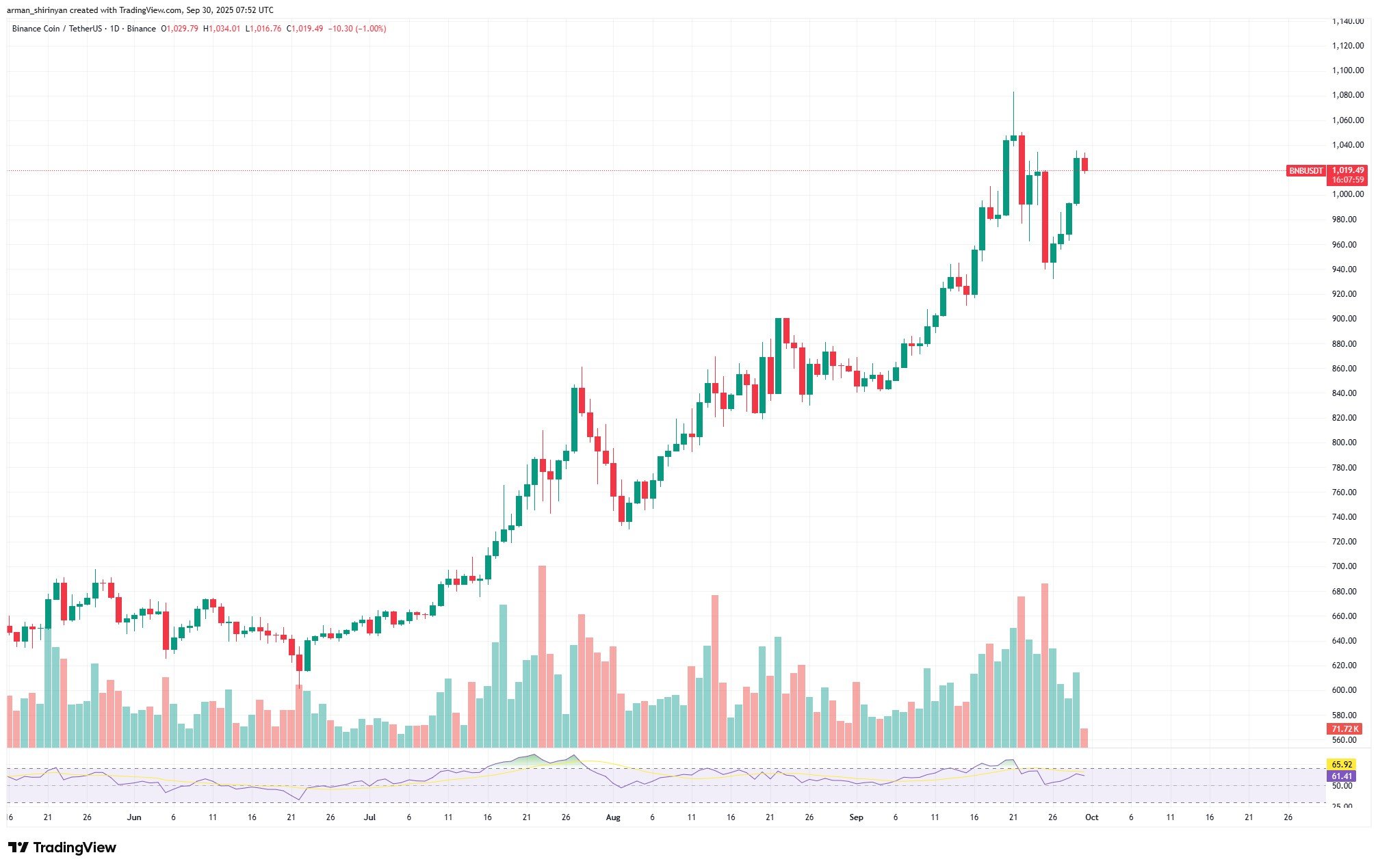 价格表现方面,BNB自9月中旬以来持续走强,短暂回调后迅速收复失地。该代币日线已站稳两条关键均线(50日均线905美元与100日均线841美元),表明底层看涨动能强劲。由于交易量保持稳健且RSI尚未进入超买区间,上行空间依然存在。