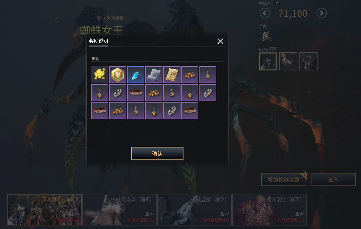 第一类为单人副本,每日提供一次基础奖励机会,消耗特定道具后可额外增加两次挑战权限。该类副本主要掉落材料类资源,包括狗粮、金币、白金货币及魔力根源等。战斗中需注意规避环境伤害:蜘蛛副本中应远离毒雾区域,避免持续掉血导致失败;石头人副本则需避开岩浆地带,并尽量闪避大范围技能攻击以确保生存。第二类是随机副本,采用四人组队形式,支持通过佣兵系统自动匹配队友,无需担心组队困难。每天有两次基础挑战次数,使用道具可追加三次。产出内容涵盖武器、首饰、强化石、金币和设计图等实用物品。整体难度较低,即使依赖AI队友也能顺利完成任务。