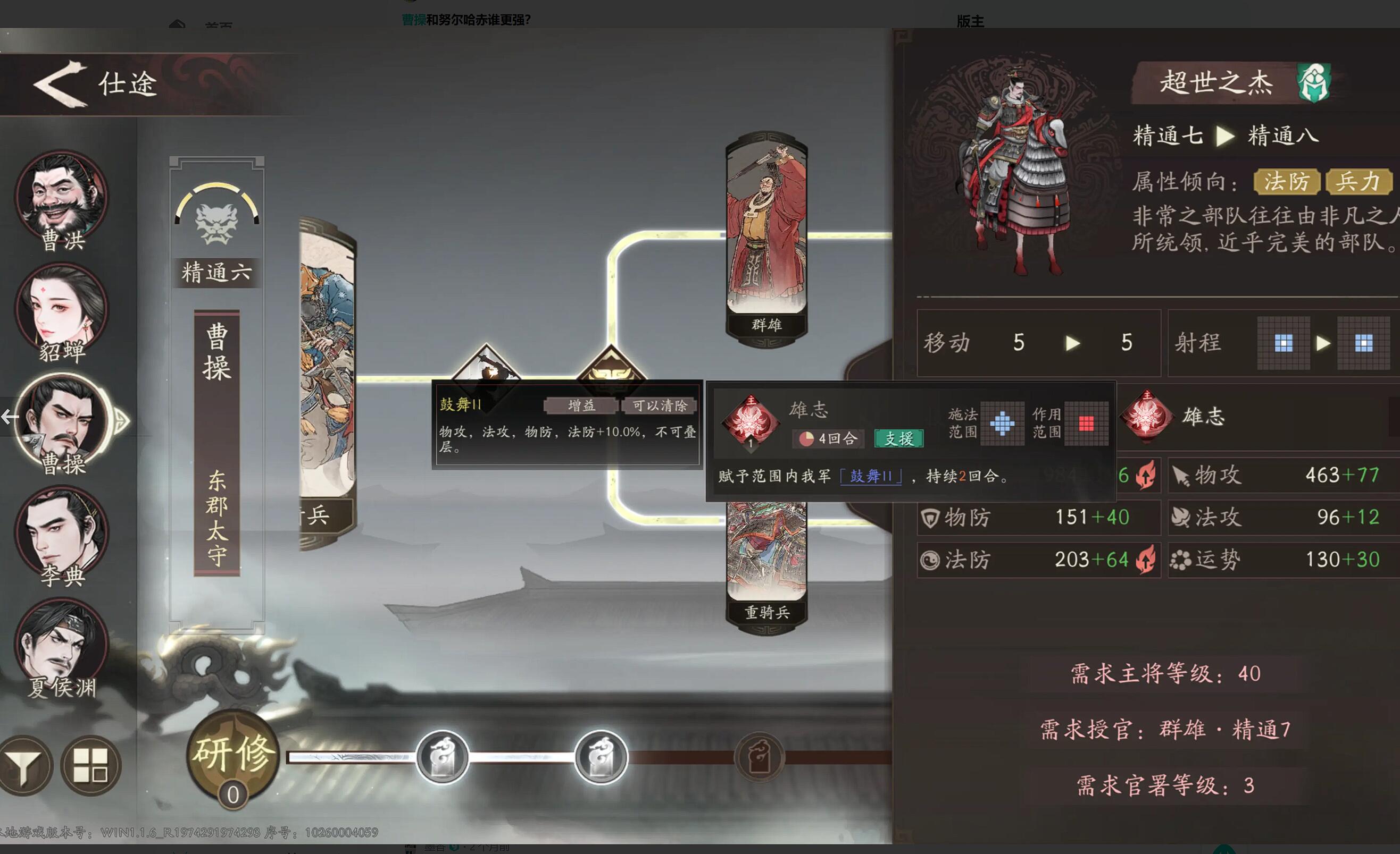 阵容确定后,技能加点策略至关重要。优先升级群雄线中的“魏武挥鞭”,该技能可造成范围伤害,并附加16%的增伤与减伤效果,是前期过渡的关键增益技能。随后解锁重骑兵线的“天下归心”,这是游戏中唯一的光环类技能,能提升菱形两格范围内单位10%的战法伤害。建议先将重骑兵线升至40级以获得“天下归心”,再补足群雄线的“魏武挥鞭”,最后点出“雄志(超世之杰)”来延长天赋兵法的持续时间。该技能可为全队提供10%的攻防加成,并能与其它增益叠加,显著提升战斗容错率。