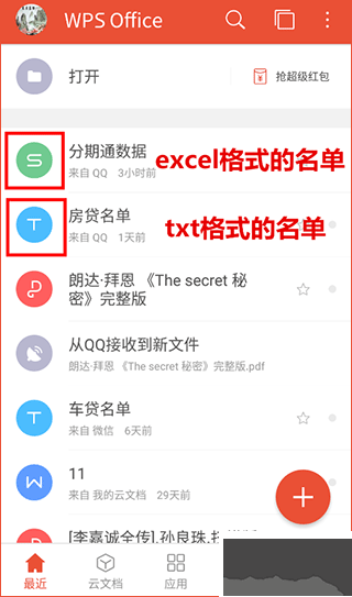2、如果电脑存储了大量电话名单,可直接将名单传到手机上,用WPS打开电话名单后复制粘贴到电销神器。不同格式名单在WPS中显示的图标不一样,如下图: