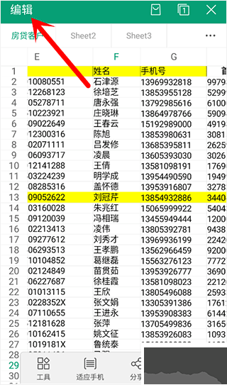 3、点击打开excel格式的名单,点击编辑进入编辑模式,不进入编辑模式只能查看文档内容不能全选复制。