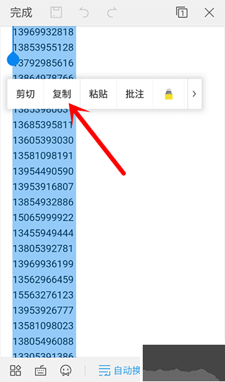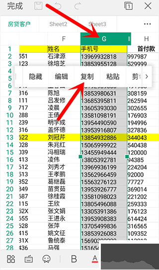 注意:其他电话名单手机号不一定是G列,只要找到手机号这列点击最上的字母就会选中本列所有号码;选中号码后复制条往右滑动出现复制选项。