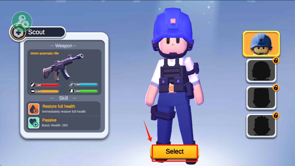 1、进入游戏,选择角色,点击“Select”按钮进入游戏准备界面。