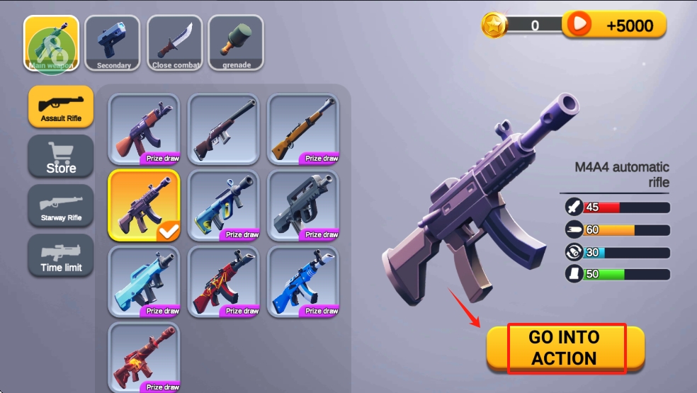 2、在武器库中,选择主武器,如M4A4自动步枪,点击“GO INTO ACTION”按钮开始游戏。