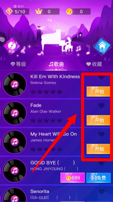 1.点击“开始”按钮快速进入关卡,享受指尖音乐乐趣,让每一首曲子都成为一场精彩演奏盛宴。