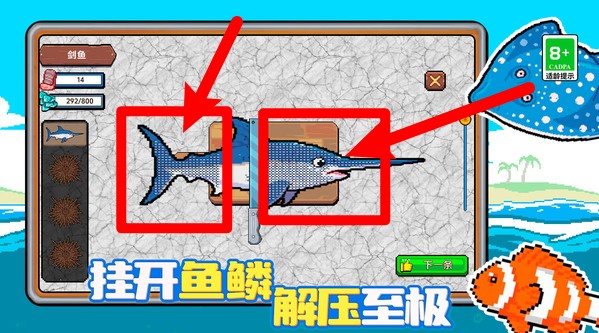 3.轻松升级:刮鱼鳞获得积分解锁更多鱼类和特殊道具,逐步提升挑战难度与奖励,形成有趣成长机制,持续保持新鲜感。