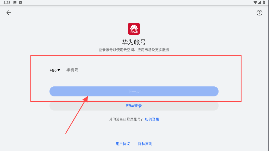 3、在新的页面内填写手机号登录华为账号,即可开始游戏