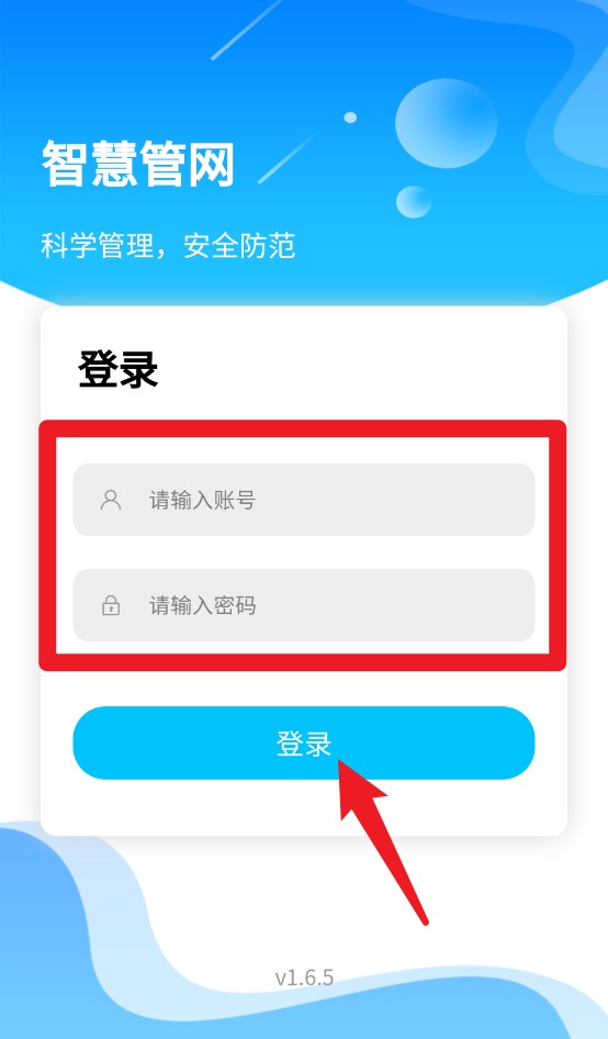 1、打开智慧管网应用后,首先进入登录界面,输入账号与密码后点击下方蓝色“登录”按钮进入系统。