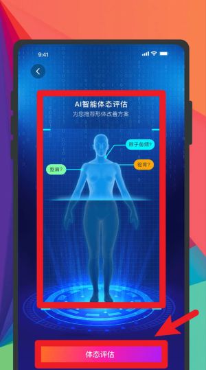 4、点击“体态评估”进入AI智能分析界面,系统将自动扫描身体姿态并生成改善建议方案。