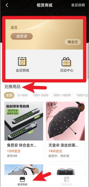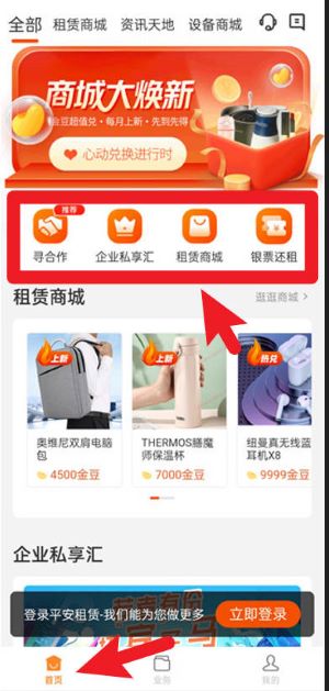 1、打开APP,点击底部导航栏“租赁商城”图标或底部导航栏“首页”按钮,可快速进入商品兑换区。