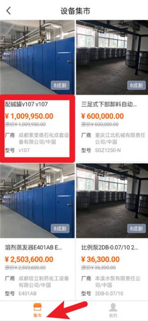 3、设备集市展示多款二手工业设备,包含详细厂商、型号与价格信息,方便企业选购。