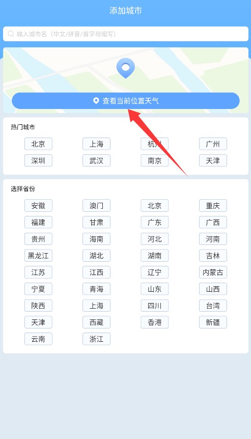 1、首次使用需开启位置访问权限,系统将自动定位所在城市,也支持手动输入其他城市查询。