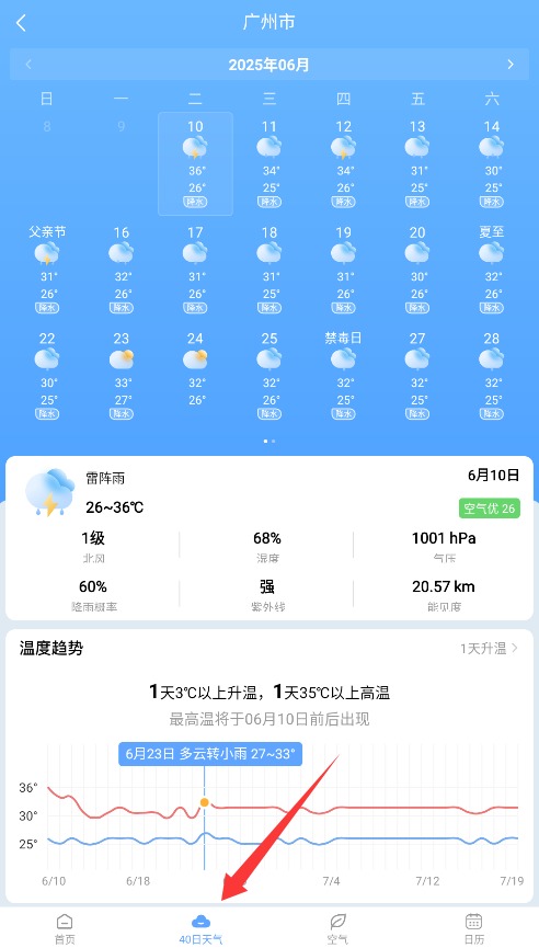 3、通过长期预报功能可查阅未来40日的天气趋势,包括温度变化和降水概率预测。