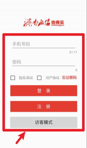 1、打开“协商云”APP,输入手机号码与密码并勾选协议,点击登录进入主页面。
