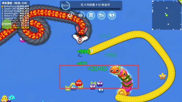 2、丰富场景元素:竞技场中有各种助推器、硬币和宝石,可用来提升蠕虫,同时蠕虫不能与其他蛇碰撞,充满挑战。