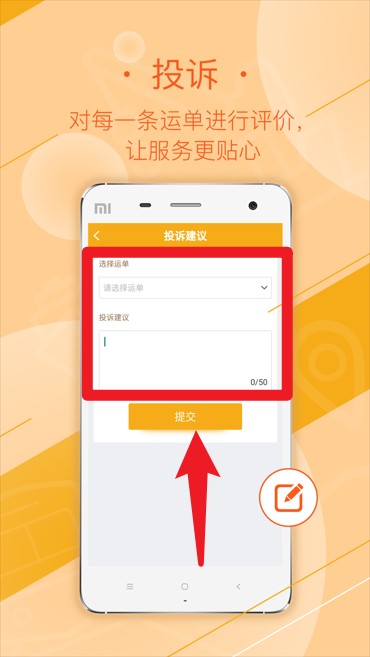 3、在投诉建议页面选择运单并填写内容,提交服务评价或建议。