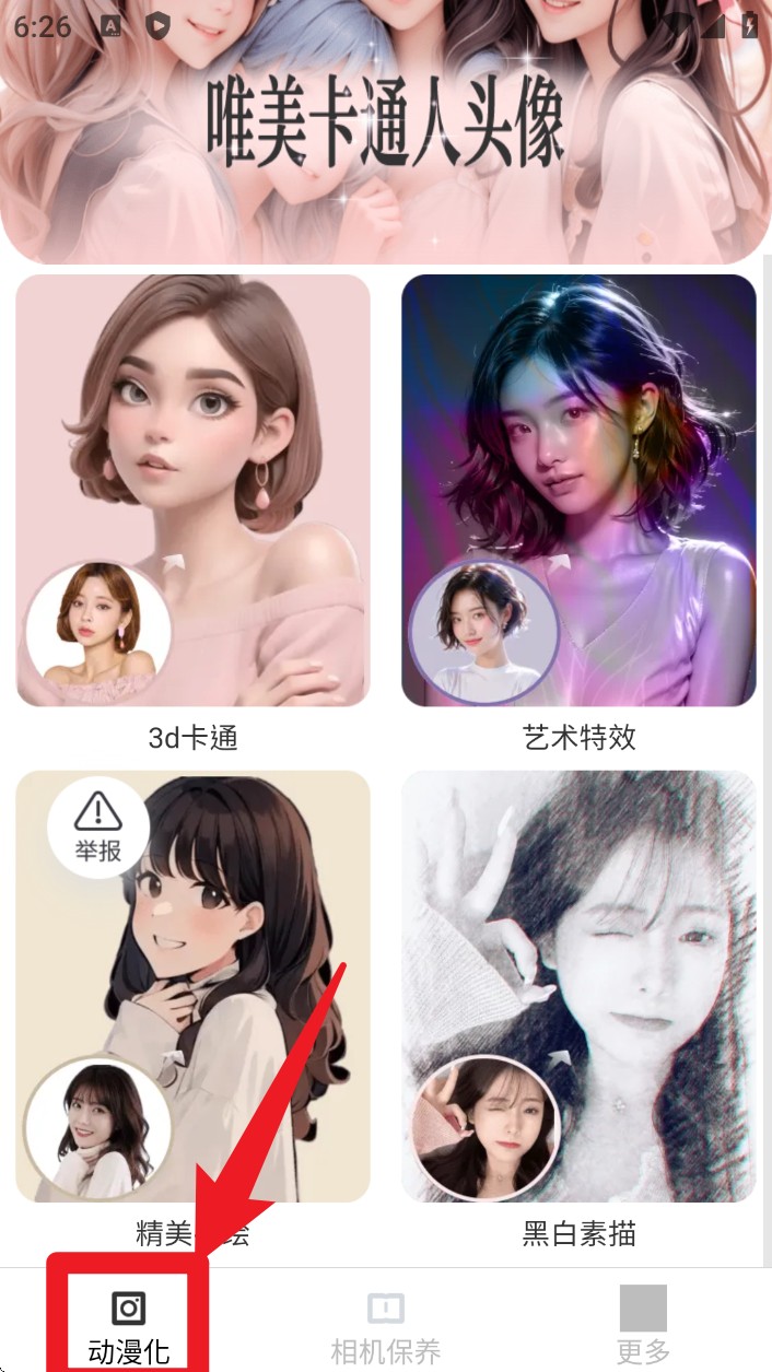 1. 打开 App 并点击底部的「动漫化」按钮,选择喜欢的风格,如 3D 卡通或艺术特效,再上传照片。
