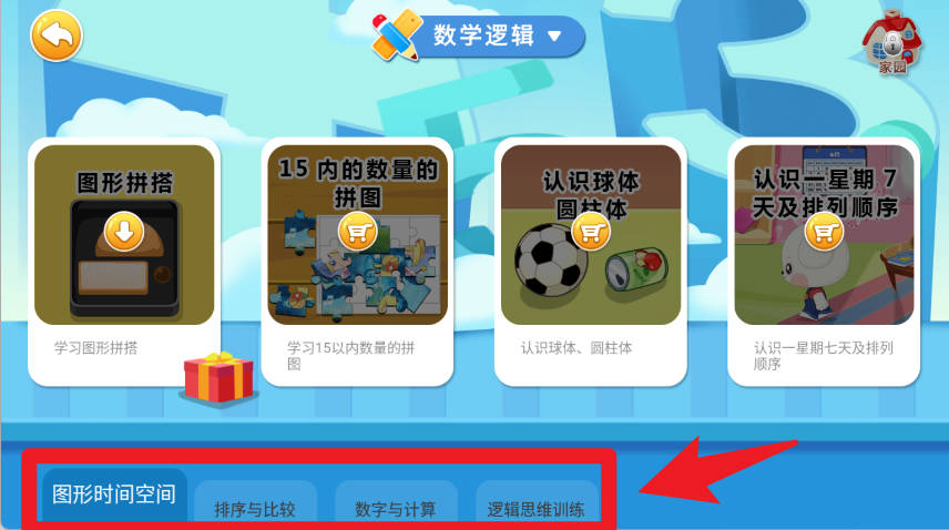 3、进入数学逻辑板块后,可体验图形时间空间、排序与比较和逻辑思维训练等趣味课程。