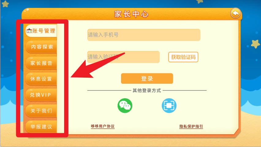 5、家长中心提供账号管理、内容探索、休息设置和举报建议等功能。