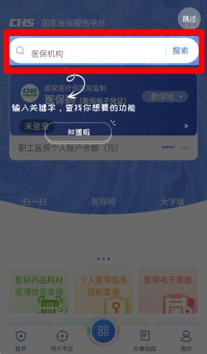 1、首页顶部提供搜索框功能,用户可直接输入关键词,如“医保机构”或“定点医院”,快速查找相关服务入口。