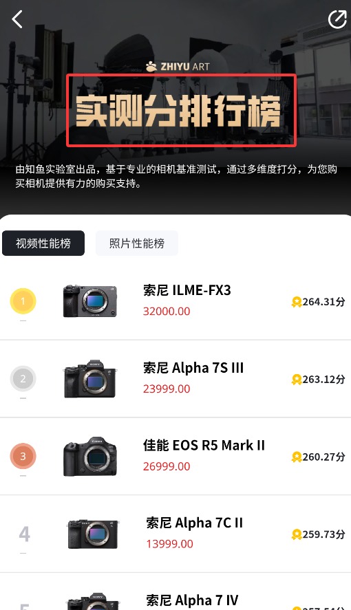 4、进入实测榜单页面后,可参考视频性能与照片性能的专业评分排行榜辅助选购决策。