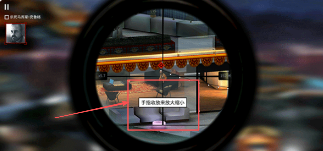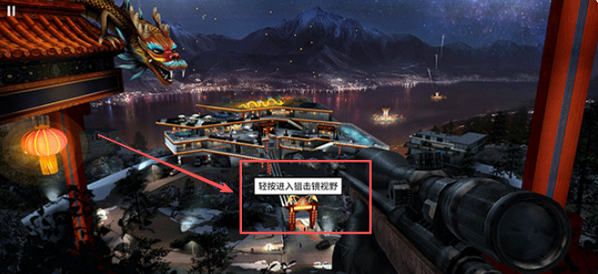 2、轻触屏幕进入专业的瞄准视角,通过手指收放自由调整狙击镜的放大倍数。