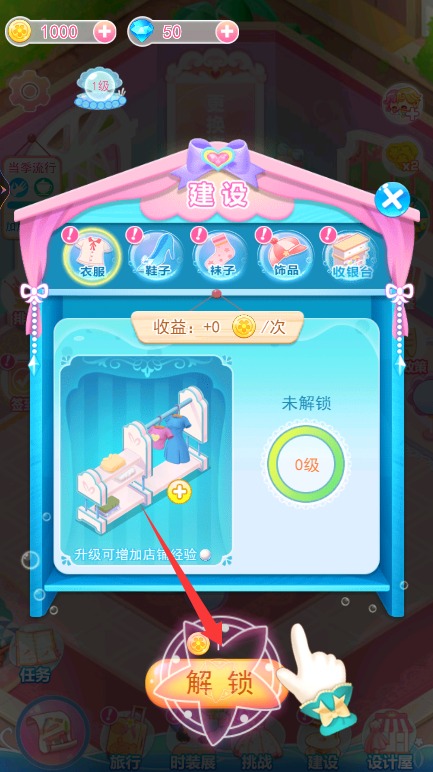 2、点击建设功能按钮为店铺添置服装展示架,逐步完善化妆间的设施布局。