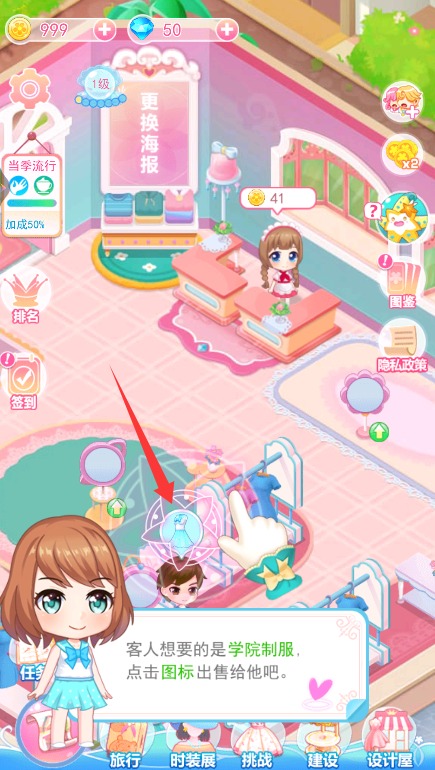 4、当顾客头顶出现衣服图标时点击交互,根据需求推荐并成功出售对应服饰。